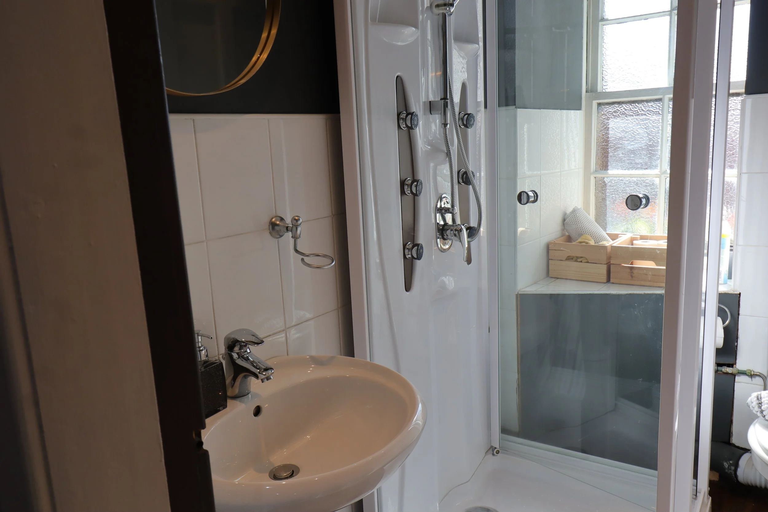 The bathroom features a step-in shower with fitted body jets, providing a refreshing start or end to your day.